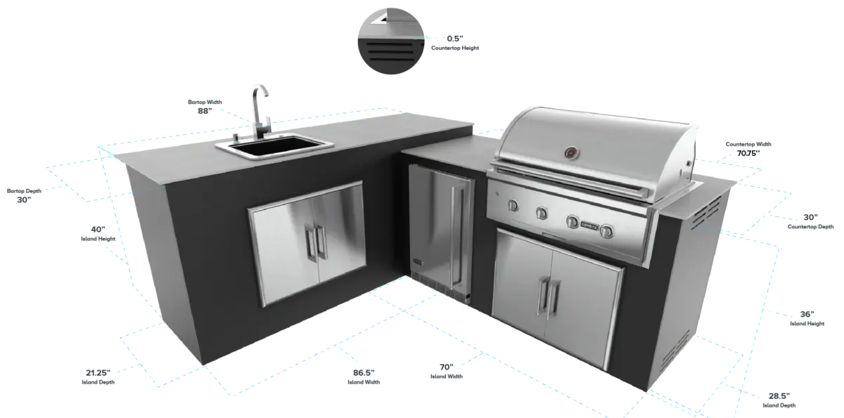 Hosting has never been easier with the M6 L-Shape Waste Bin & Sink Island. You’ll be hosting the same day your outdoor kitchen arrives! And for appliances? The 14” Single Pull-Out Trash & Recycle will keep your yard tidy and spotless without any extra effort. Access to the interior of your outdoor kitchen for repairs has never been more stylish and functional with the 31” 304 stainless steel double access doors. The 304 stainless steel Coyote Outdoor Sink makes cleanup a breeze. And for the grill? The Coyote 36” C-Series grill won’t disappoint. Your guests won’t believe how good the food is! Here’s the specs: